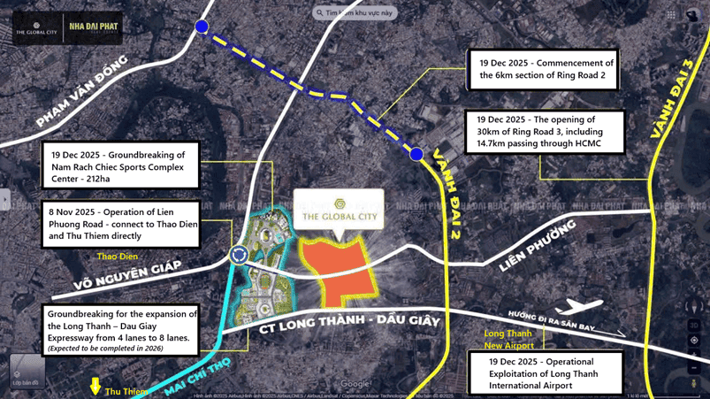 The Global city đặc biệt lợi thế khi kết nối trực tiếp vào tuyến cao tốc Long Thành Giầu dây – là tuyến cao tốc huyết mạch duy nhất của thành phố để đến được sân bay quốc tế mới Long Thành (Dự kiến sẽ đi vào hoạt động trong năm 2026 và tất các các chuyến bay quốc tế sẽ được chuyển về sân bay Long Thành thay cho sân bay Tân Sơn Nhất luôn trong tình trạng quá tải. Đây là lợi thế mà hiếm dự án nội đô nào sở hữu, đặc biệt trong bối cảnh TP Thủ Đức đang được quy hoạch trở thành “thành phố trong thành phố” với vai trò trung tâm kinh tế – công nghệ.